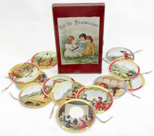 Le Thaumatrope (du grec thauma, prodige et tropion, tourner) est un un jouet basé sur un principe visuel qui se nomme la « persistance rétinienne ». Il s’agit d’un disque illustré sur ses deux faces et où sont accrochées de petites ficelles sur deux bords opposés, où encore autour d’un simple bâton. En faisant tourner entre le pouce et l’index ces ficelles ou le bâton, le disque suit le mouvement et les deux dessins se confondent. Notre œil « imprime » une image fixe déjà vue et la superpose avec une image fixe vue immédiatement après : notre esprit mélange les deux images, il n’en perçoit qu’une seule.